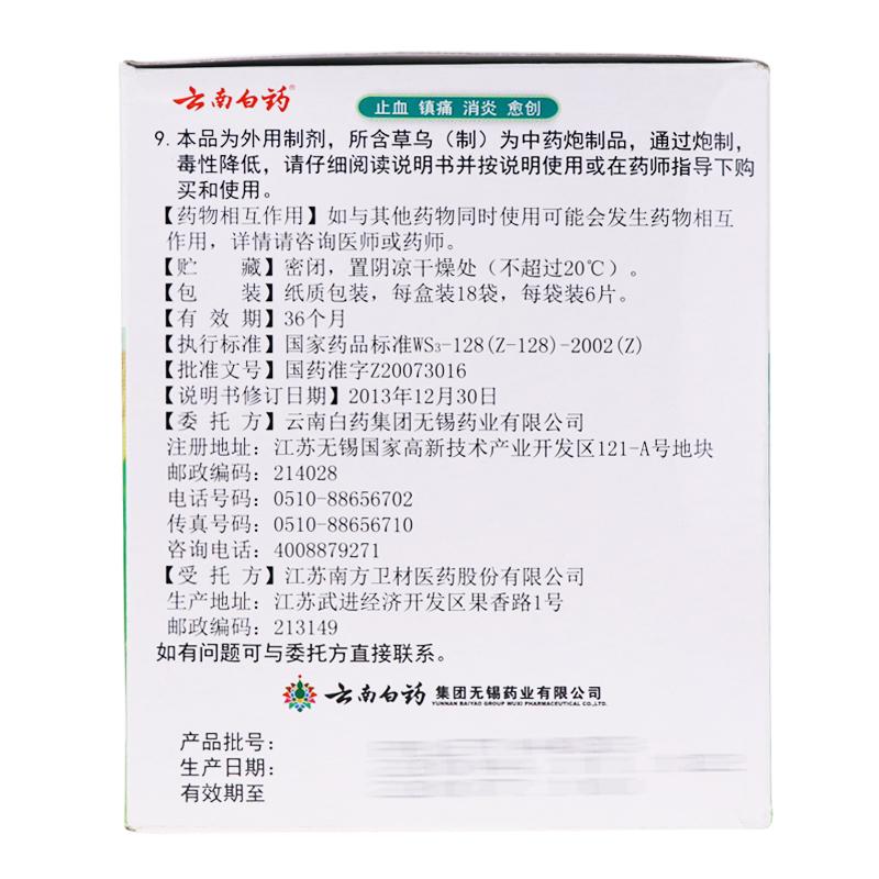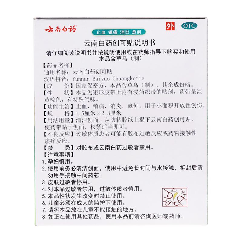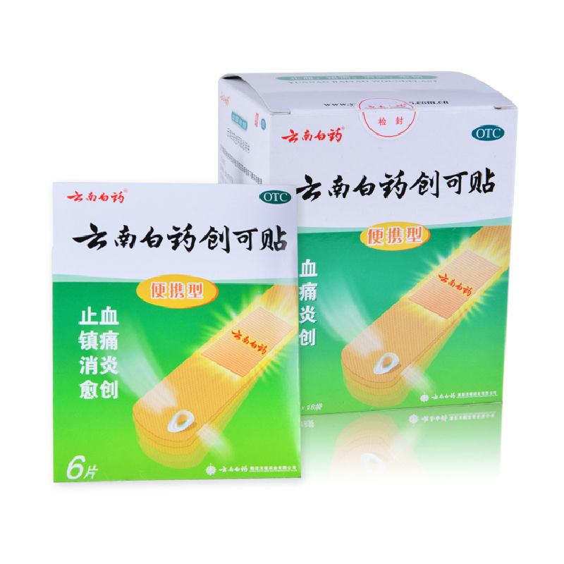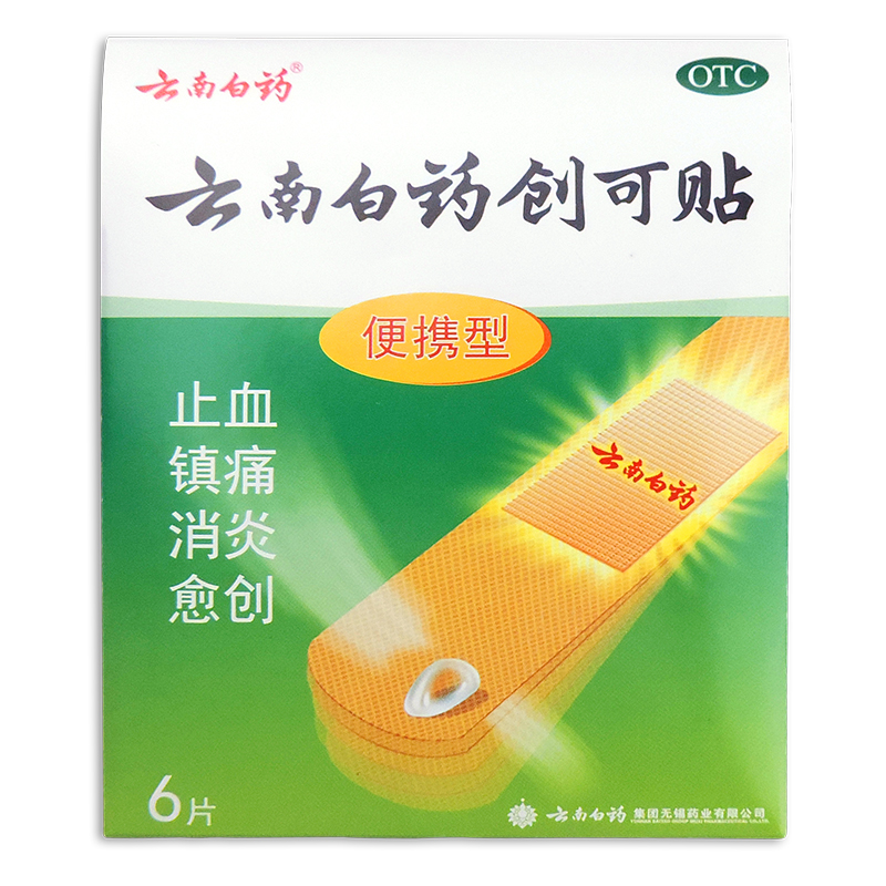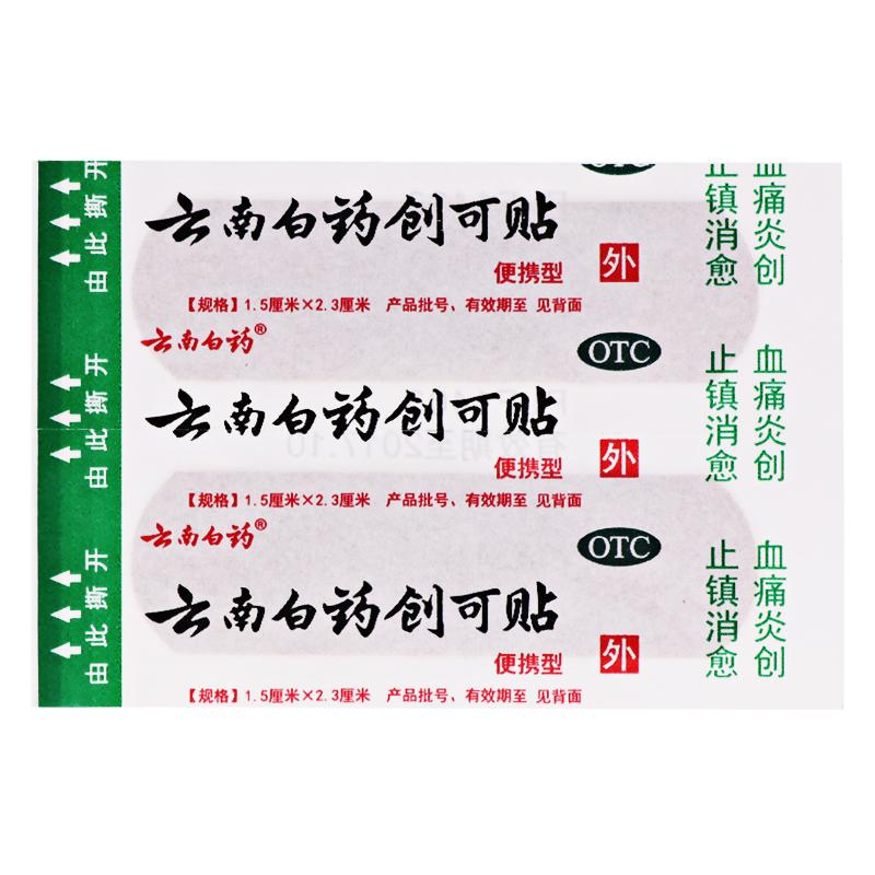 - 用法用量:清洁创面,从防粘胶纸上揭下云南白药创可贴,使药带贴于创面,松紧适当即可。