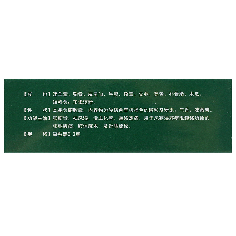 - 适应症/功能主治:强筋骨,祛风湿,活血化瘀,通络定痛。用于风寒湿邪痹阻经络所致的腰腿酸痛,肢体麻木,及骨质疏松。