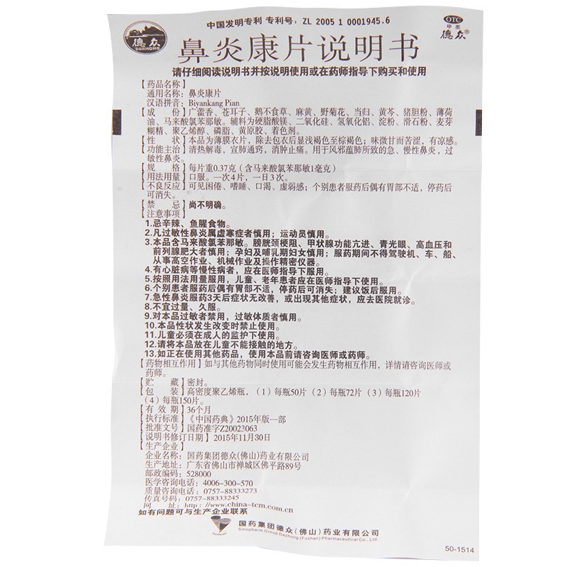 - 商品名称:德众 鼻炎康片 0.37g*72片