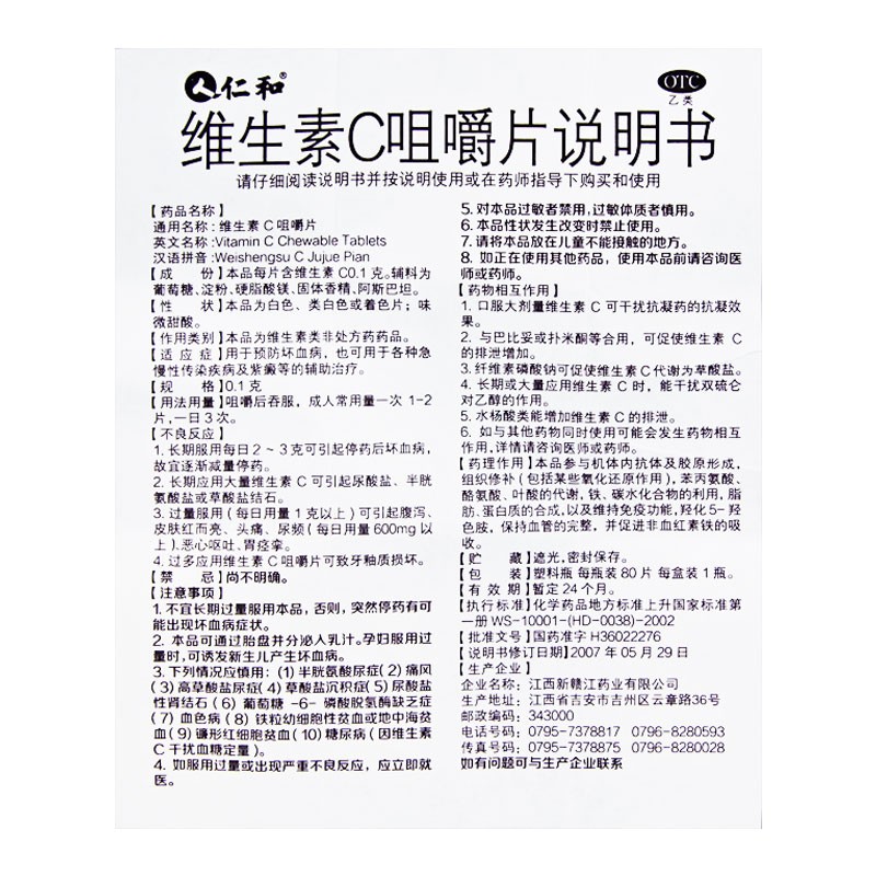 - 通用名称:维生素C咀嚼片/仁和