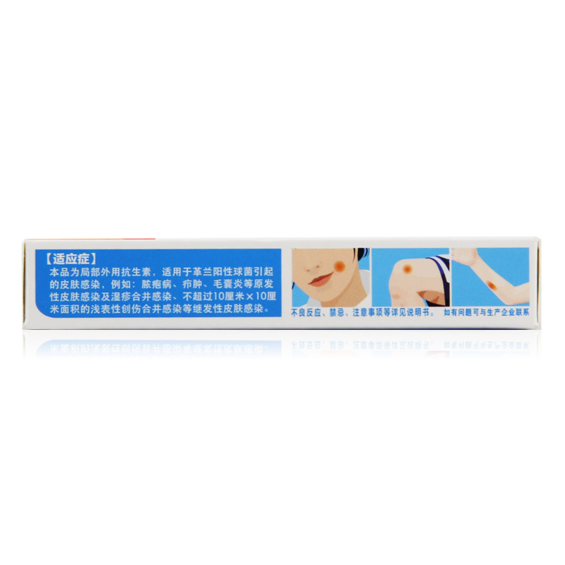 - 适应症/功能主治:【功能主治】本品为局部外用抗生素,适用于革兰阳性球菌引起的皮肤感染,例如:脓包病、疖肿、毛囊炎等原发性皮肤感染及湿疹合并感染、不超过10厘米×10厘米面积(10厘米长)的浅表性创伤合并感染等继发性皮肤感染。