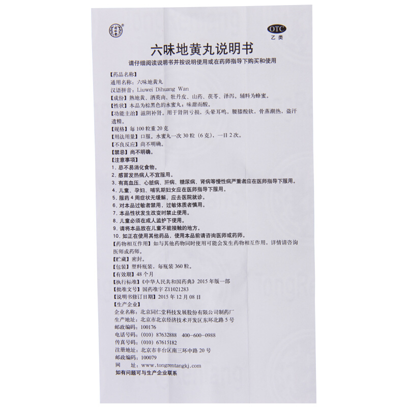 - 商品名称:同仁堂 六味地黄丸 360丸/瓶