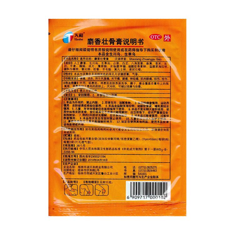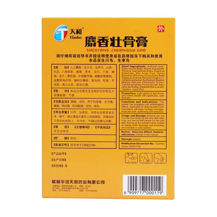 - 商品名称:天和 麝香壮骨膏 7cm*10cm*5贴*2袋/盒