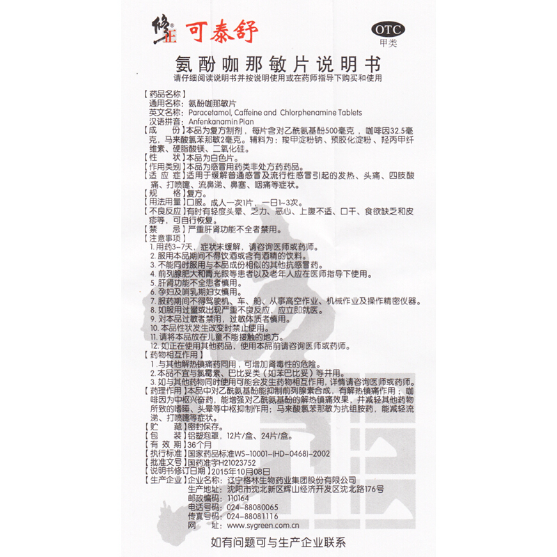 - 通用名称:氨酚咖那敏片(可泰舒)