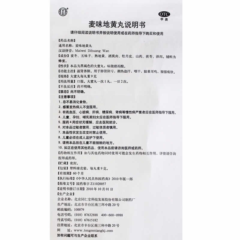 - 商品名称:同仁堂 麦味地黄丸 9g*10丸