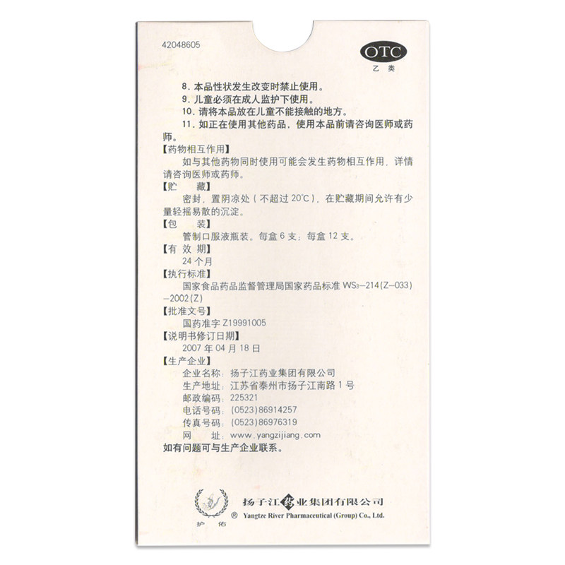 - 用法用量:口服,一次20毫升(2支),一日3次。