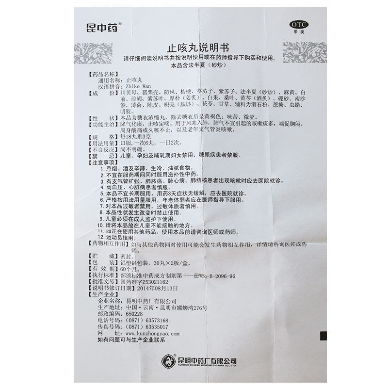 - 商品名称:昆中药 止咳丸 30丸*2板/盒