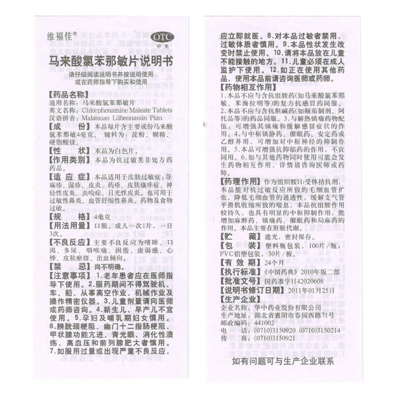 - 商品名称:维福佳 马来酸氯苯那敏片 4mg*100片/瓶