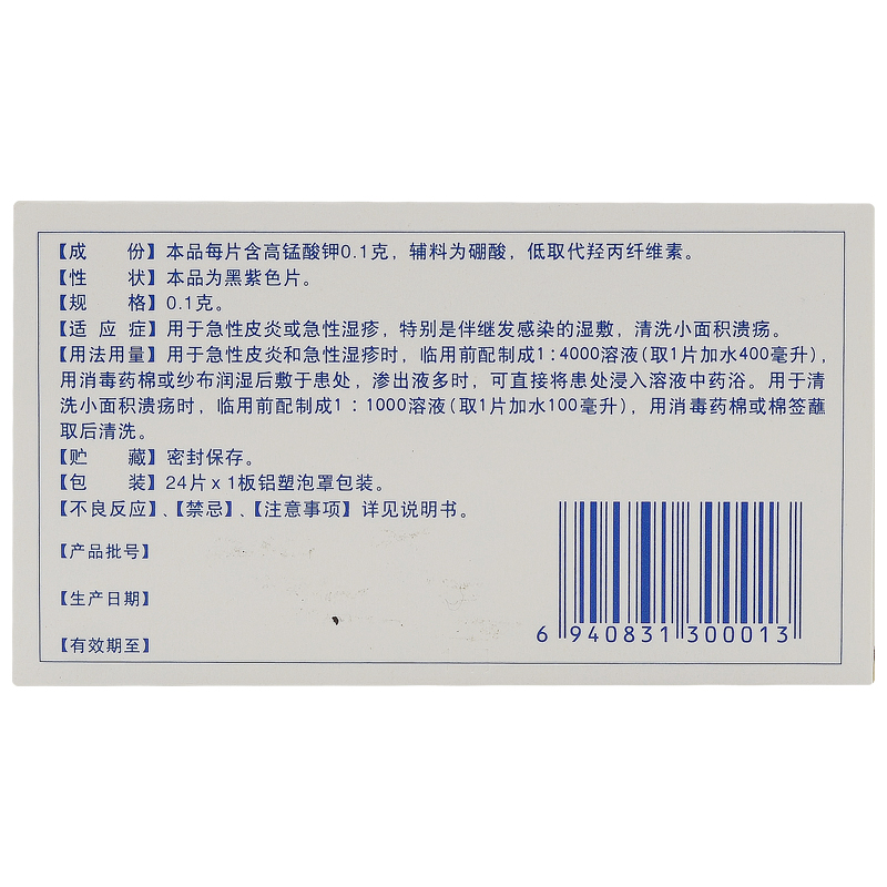 - 适应症/功能主治:用于急性皮炎或急性湿疹,特别是伴继发感染的湿敷,清洗小面积溃疡。