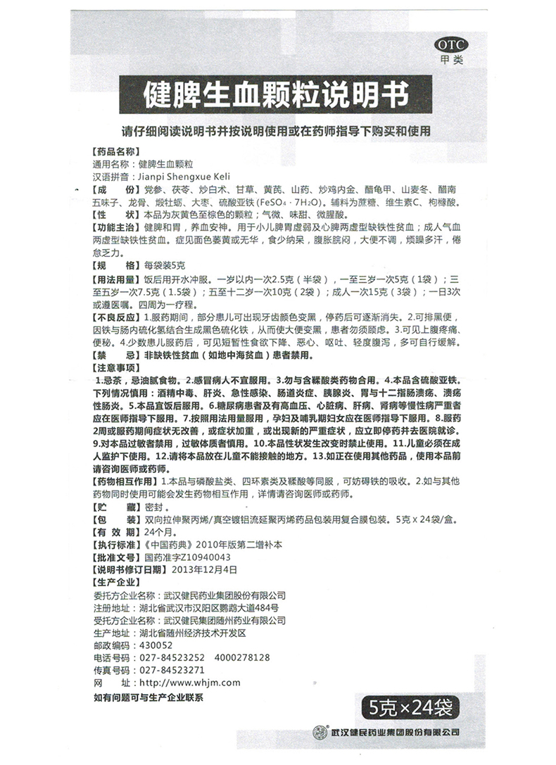 - 商品名称:健民 健脾生血颗粒 5g*24袋/盒