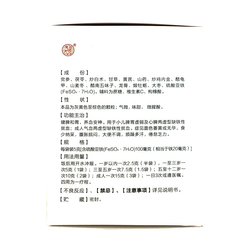 - 适应症/功能主治:健脾和胃,养血安神。用于小儿脾胃虚弱及心脾两虚型缺铁性贫血;成人气血两虚型铁性贫血。症见面色萎黄或无华,食少纳呆,腹胀皖闷,大便不调,烦躁多汗,倦怠乏力。