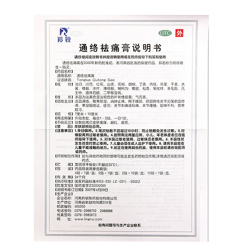 - 通用名称:通络祛痛膏(骨质增生一贴灵)