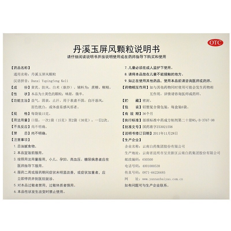 - 商品名称:云丰 丹溪玉屏风颗粒 15g*6袋/盒