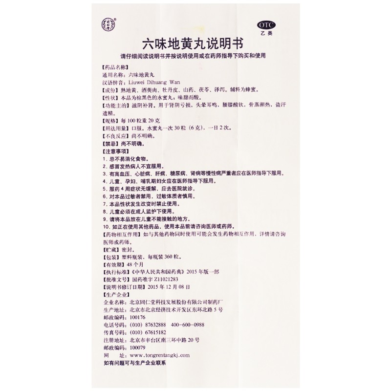 - 商品名称:同仁堂 六味地黄丸 360粒/瓶