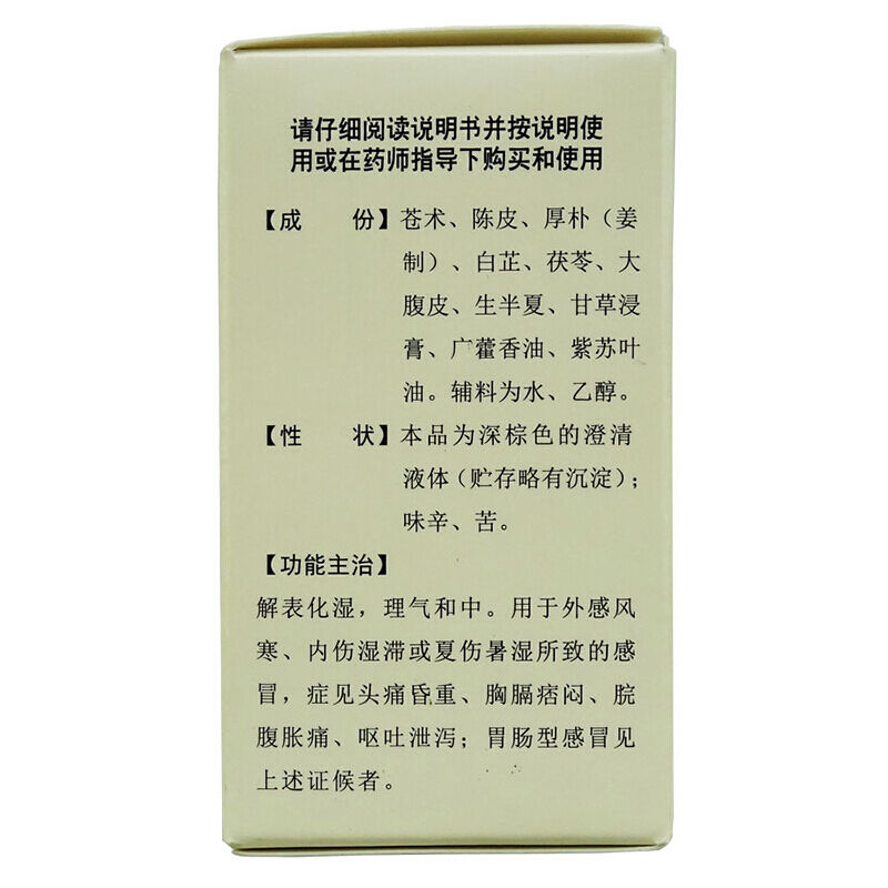 - 适应症/功能主治:解表化湿,理气和中。用于外感风寒,内伤湿滞或夏伤暑湿所致的感冒,症见头痛昏重,胸膈痞闷,脘腹胀痛,呕吐泄泻,胃肠型感冒见上述证候者。