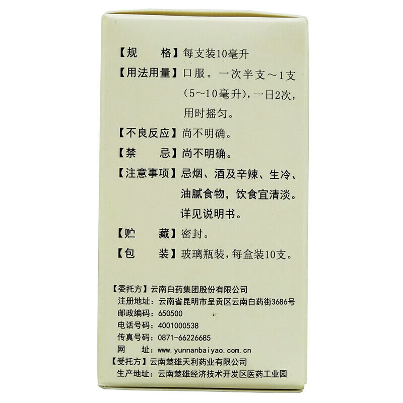 - 用法用量:口服,一次半支~1支(5~10毫升),一日2次,用时摇匀。
