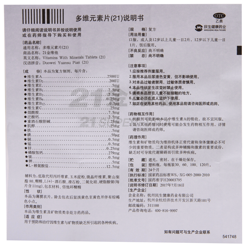 - 商品名称:21金维他 多维元素片(21)60片/瓶