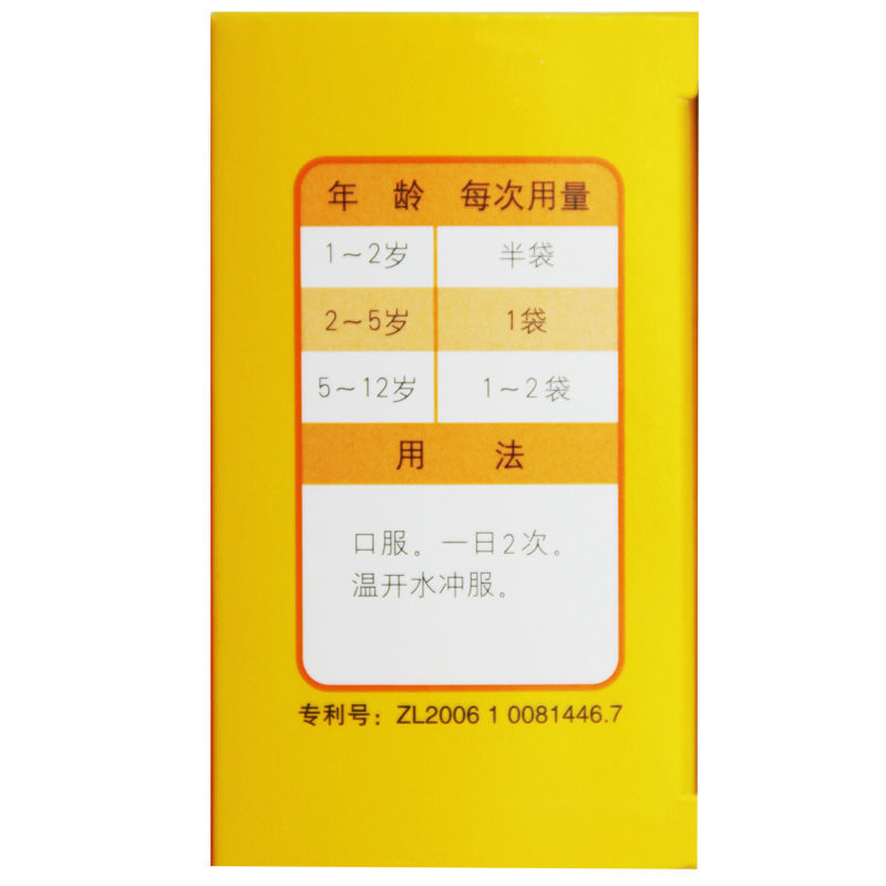 - 用法用量:口服。1~2岁儿童:一次半袋;2~5岁:一次1袋;5~12岁:一次1~2袋;一日2次。温开水冲服。