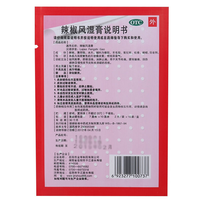 - 商品名称:金寿 辣椒风湿膏 7cm*10cm*2片/袋