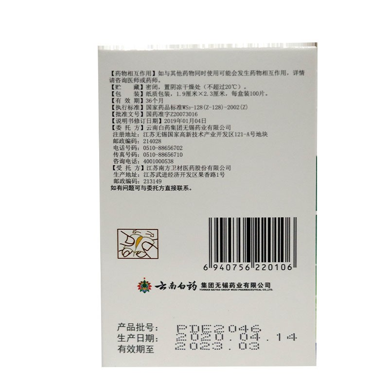 - 生产企业:云南白药集团无锡药业有限公司