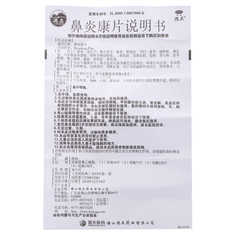 - 商品名称:德众 鼻炎康片 0.37g*72片/瓶