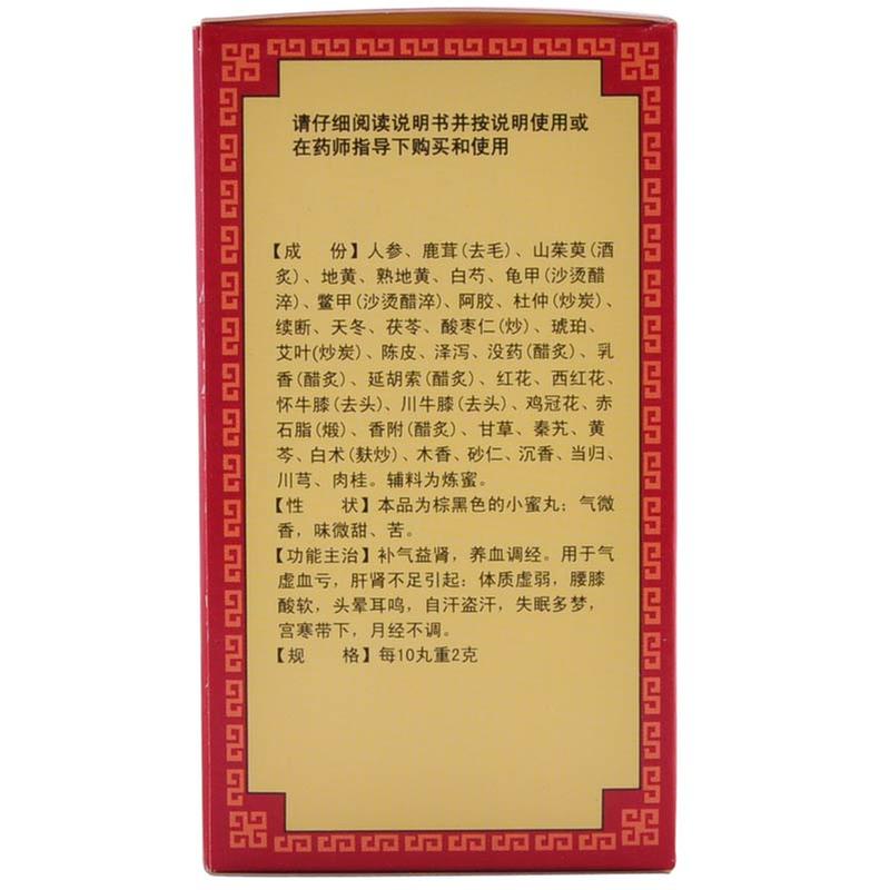 - 适应症/功能主治:补气益肾,养血调经。用于气虚血亏,肝肾不足引起:体质虚弱,腰膝酸软,头晕耳鸣,自汗盗汗,失眠多梦,肾寒精冷,宫寒带下,月经不调。
