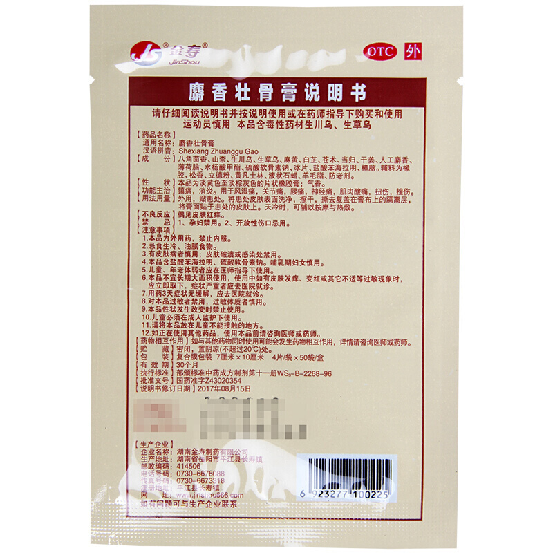 - 商品名称:金寿 麝香壮骨膏 7cm*10cm*4贴/袋