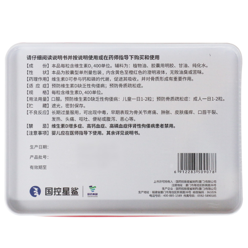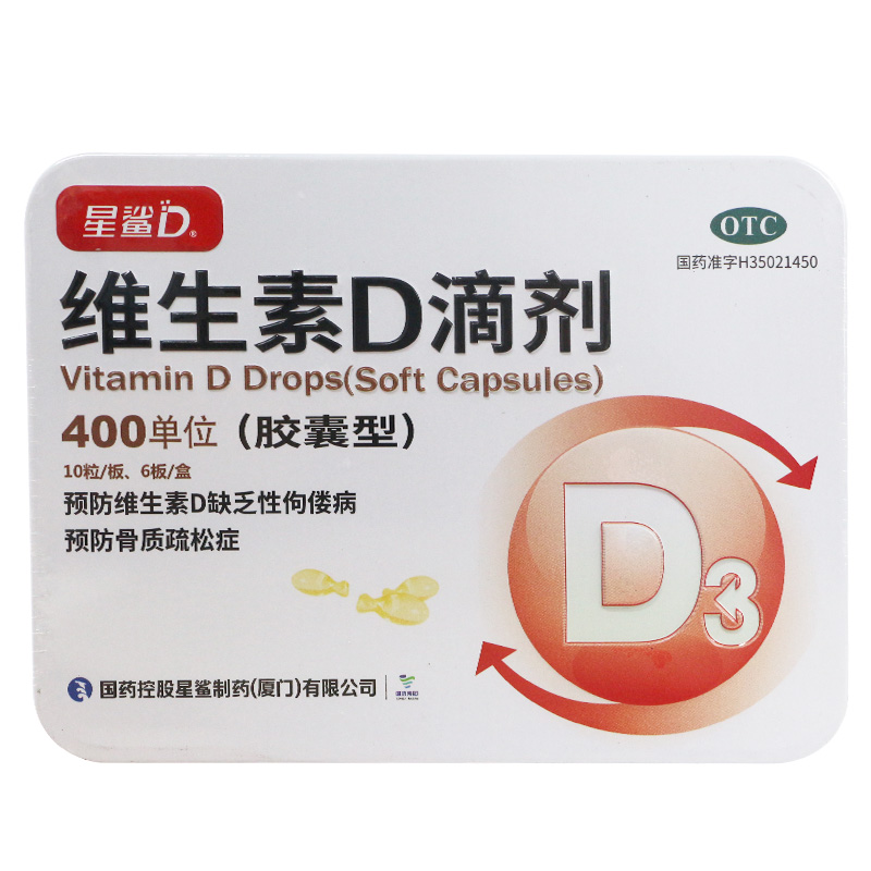 - 商品名称:星鲨 维生素D滴剂 400单位*10粒*6板/盒