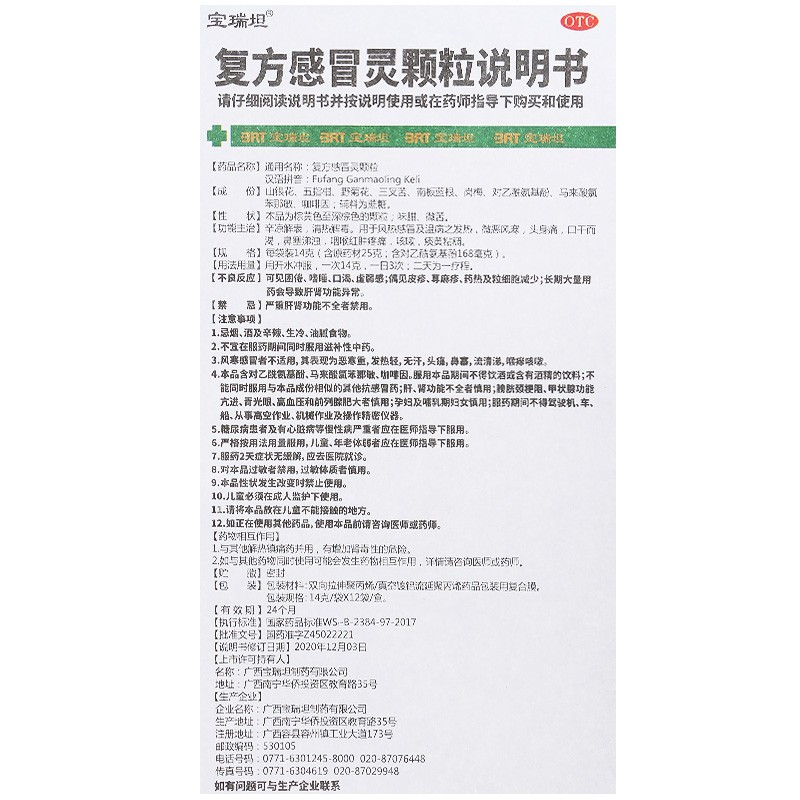 - 商品名称:宝瑞坦 复方感冒灵颗粒 14g*12袋/盒
