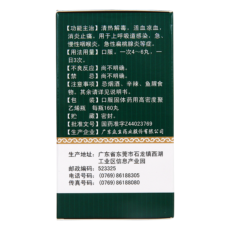 - 适应症/功能主治:清热解毒,活血凉血,消炎止痛。用于上呼吸道感染,急、慢性咽喉炎,急性扁桃腺炎,化脓性扁桃腺炎,疮毒等症。