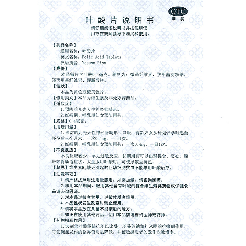 - 用法用量:1.预防胎儿先天性神经管畸形:口服,育龄妇女从计划怀孕时起至怀孕后三个月末,一次0.4mg,一日1次。 2.妊娠期、哺乳期妇女预防用药:一次0.4mg,一日1次。