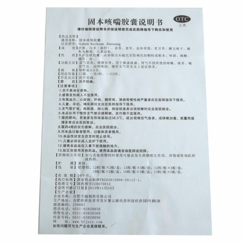 - 商品名称:制克 固本咳喘胶囊 0.4g*12粒*3板/盒