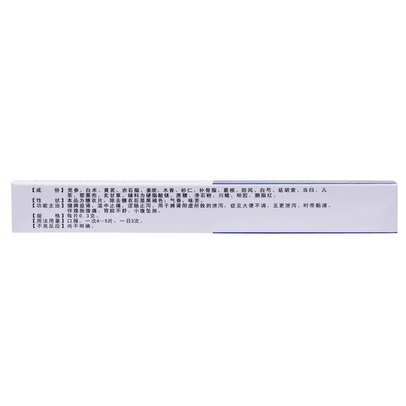 - 适应症/功能主治:健脾益肾,温中止痛,涩肠止泻。用于脾肾阳虚所致的泄泻,症见大便不调、五更泄泻、时带黏液,伴腹胀腹痛、胃脘不舒、小腹坠胀。