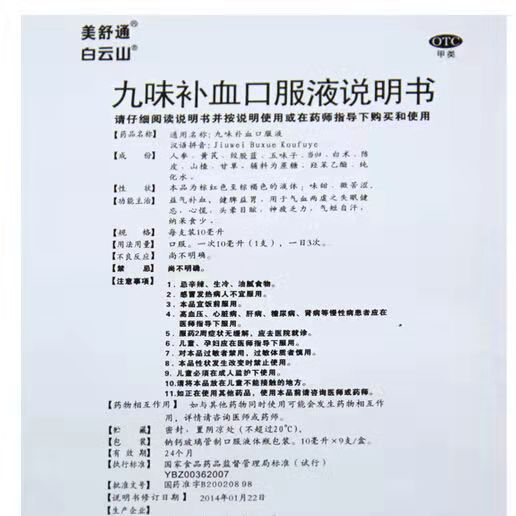 - 通用名称:九味补血口服液/美舒通