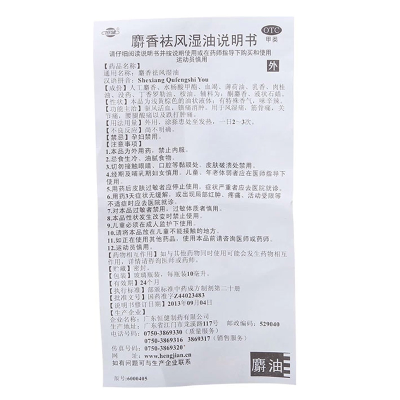 - 商品名称:恒健 麝香祛风湿油 10ml/瓶