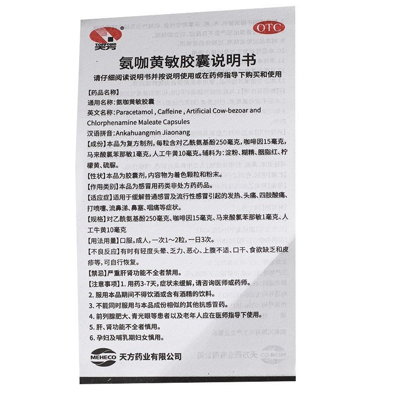 - 商品名称:天方 氨咖黄敏胶囊 10粒/板