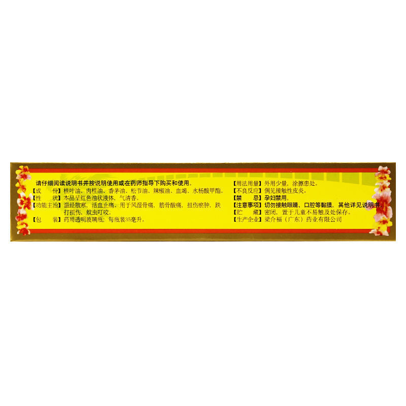 - 适应症/功能主治:温经散寒,活血止痛。用于风湿骨痛,筋骨酸痛,扭伤瘀肿,跌打损伤,蚊虫叮咬。
