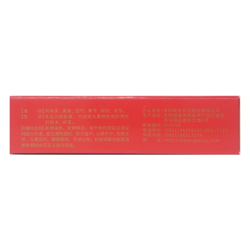 - 适应症/功能主治:滋阴清热、安神除烦。用于妇女更年期综合征阴虚火旺证,症见:潮热面红、自汗盗汗,心烦不宁,失眠多梦,头晕耳鸣,腰膝酸软,手足心热。