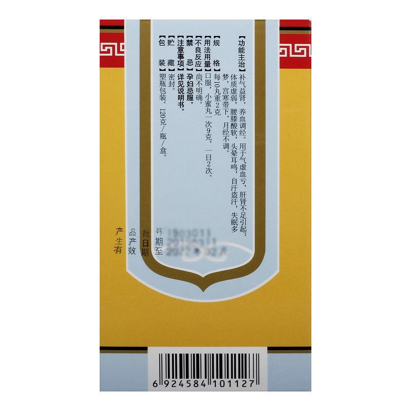 - 适应症/功能主治:补气益肾,养血调经。用于气虚血亏,肝肾不足引起:体质虚弱,腰膝酸软,头晕耳鸣,自汗盗汗,失眠多梦,肾寒精冷,宫寒带下,月经不调。