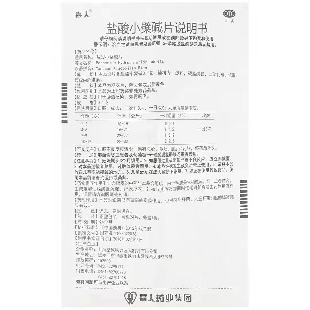 - 商品名称:喜人 盐酸小檗碱片 0.1g*24片