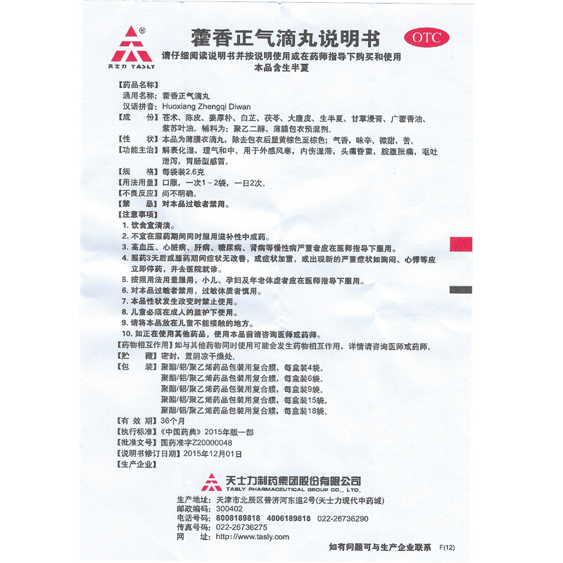 - 商品名称:天士力 藿香正气滴丸 2.6g*9袋/盒