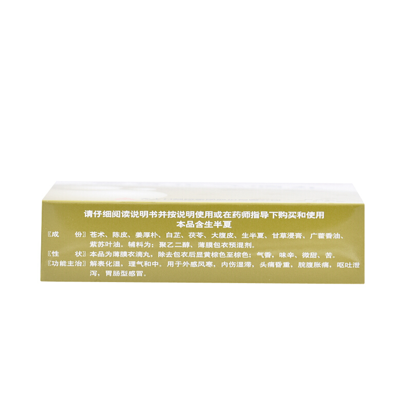 - 适应症/功能主治:解表化湿,理气和中。用于外感风寒,内伤湿滞,头痛昏重,脘腹胀痛,呕吐泄泻,胃肠型感冒。
