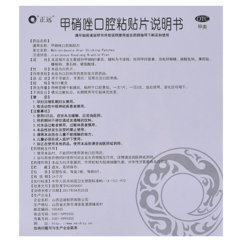 - 通用名称:甲硝唑口腔粘贴片/正远