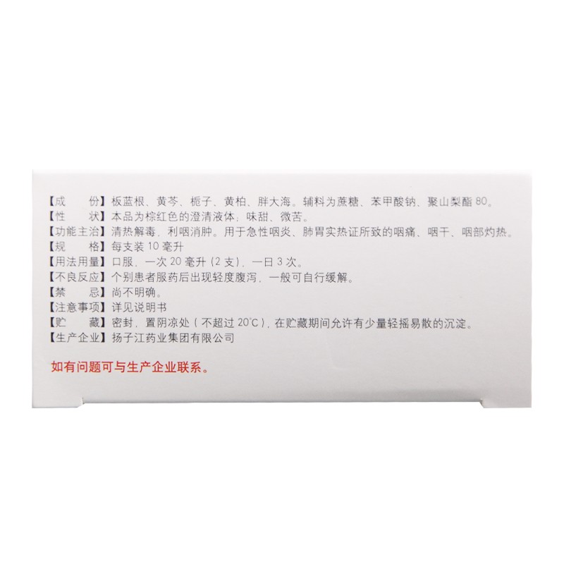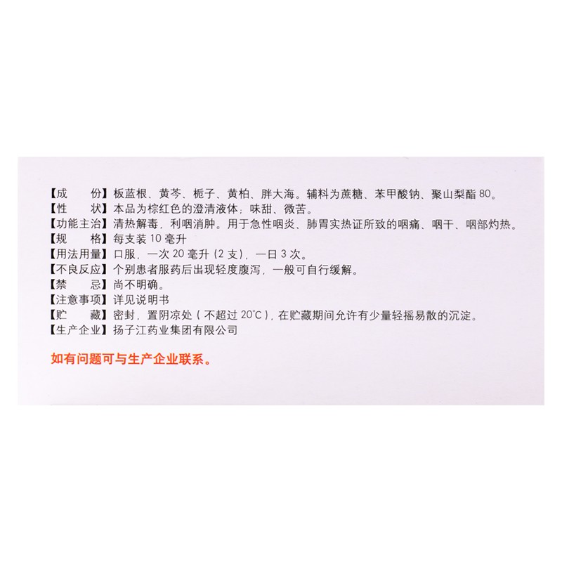 - 适应症/功能主治:清热解毒,利咽消肿。用于急性咽炎肺胃实热证所致的咽痛、咽干、咽部灼热。