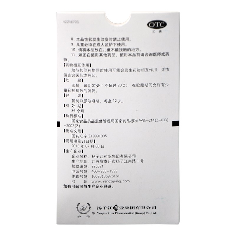 - 用法用量:口服,一次20毫升(2支),一日3次。