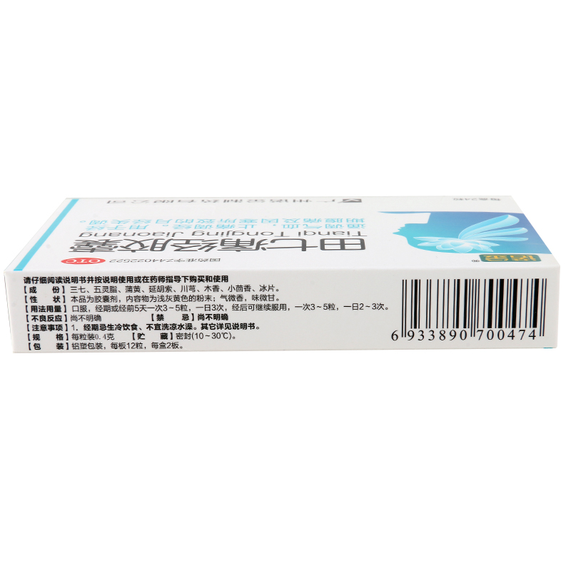 - 用法用量:口服。经期或经前5天一次3~5粒,一日3次,经后可继续服用,一次3~5粒,一日2~3次。