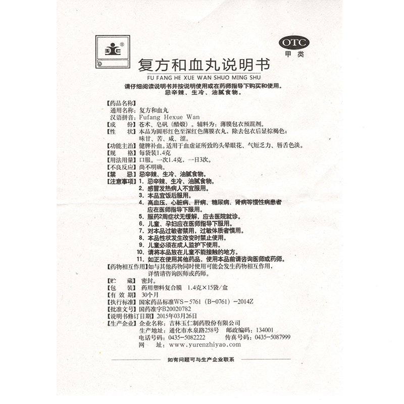 - 商品名称:玉仁 复方和血丸 1.4g*15袋/盒