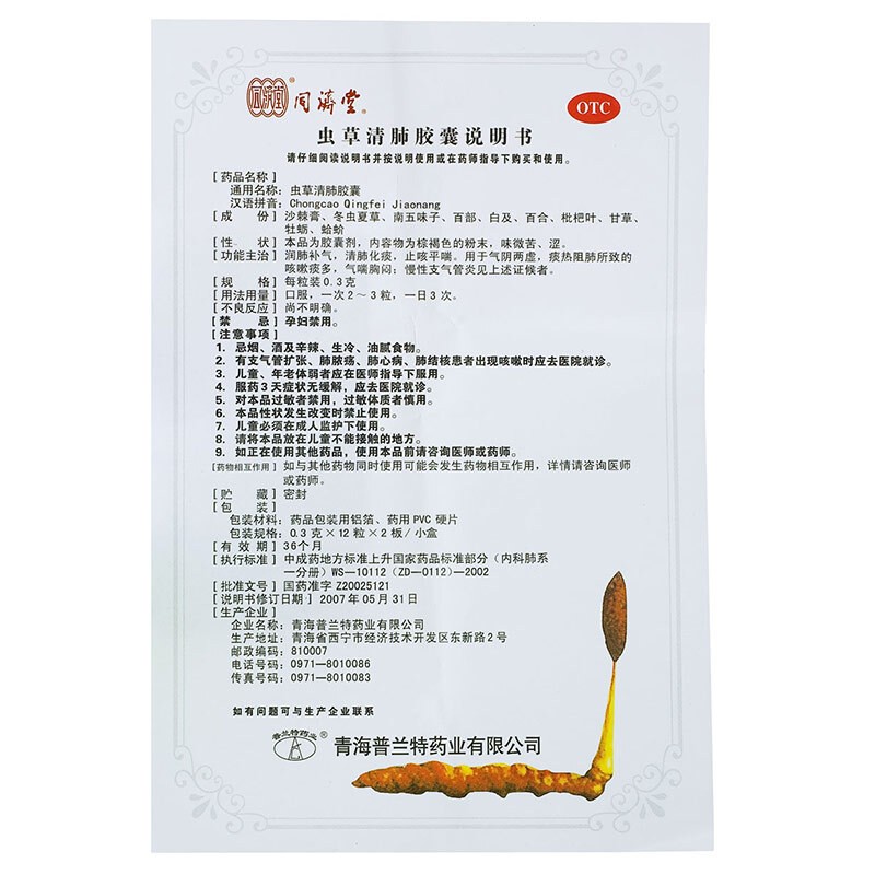 - 商品名称:同济堂 虫草清肺胶囊 0.3g*12粒*2板/盒