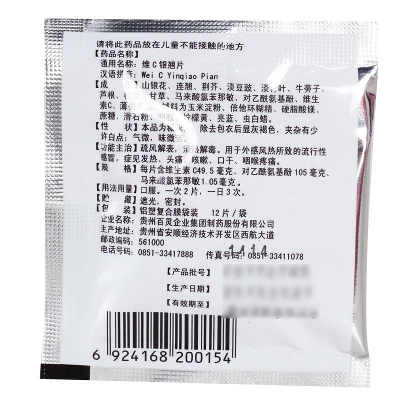 - 商品名称:百灵鸟 贵州百灵 维C银翘片 12片/袋