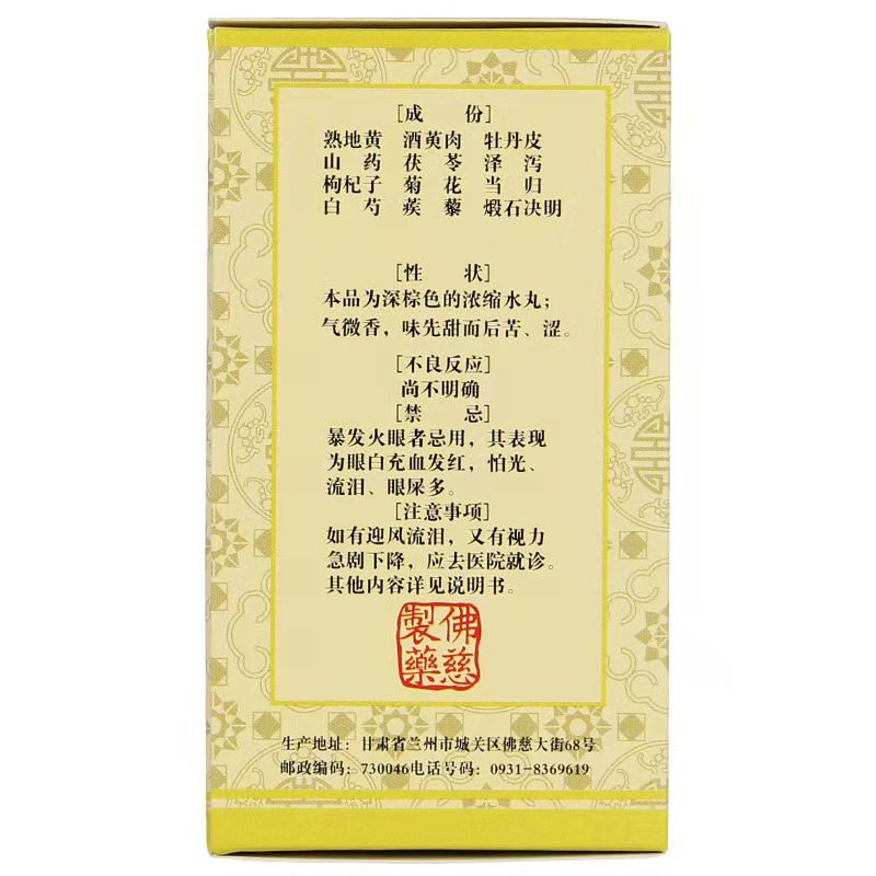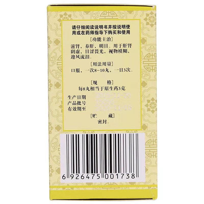 - 适应症/功能主治:滋肾,养肝,明目。用于肝肾阴虚,目涩畏光,视物模糊,迎风流泪。